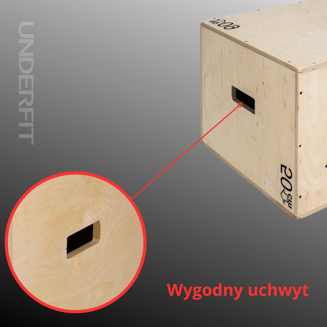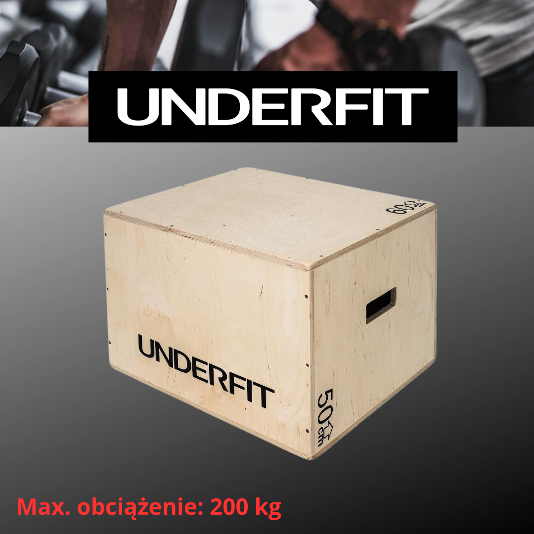 Skrzynia plyometryczna UNDERFIT została wykonana z wytrzymałej, drewnianej sklejki. Treningi z jej użyciem wzmacniają mięśnie i siłę skokową. Używana jest głownie przez crossfitowców. Dodatkową zaletą jest możliwość obracania skrzyni i otrzymywania 3 różnych wysokości. Dzięki temu możliwe jest ustawianie trudności ćwiczeń wedle własnych potrzeb i możliwości. Skrzynia UNDERFIT ma zaokrąglone rogi co pozwala na bezpieczny trening bez poważnych urazów. Z boku znajdują się dwa otwory, które ułatwiają przenoszenie skrzyni.